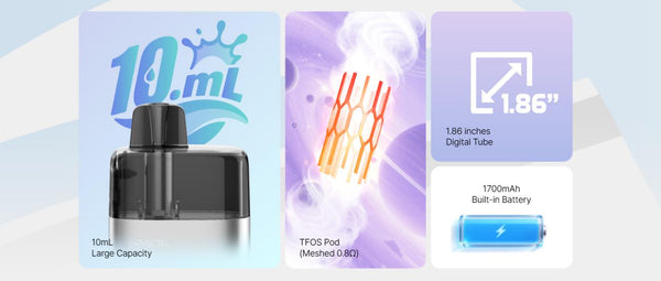 Each kit includes a pre-installed 0.8 ohm meshed TFOS pod, designed for smooth airflow and rich flavor delivery. The overall design combines user convenience and durability in one sophisticated pod system.