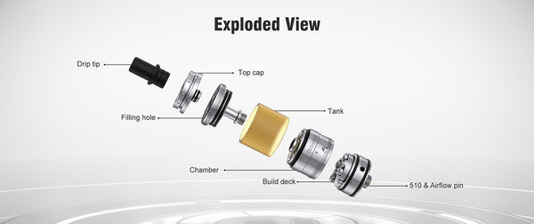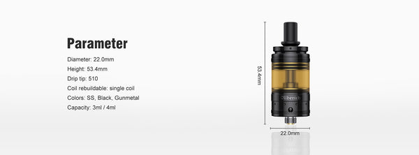 Alberich MTL RTA of 22mm diameter is specially designed for MTL vapers. With bottom airflow design, it can bring you flavorful taste and strong throat hit. It has 6 airflow pins to optimize vapor experience: 0.8mm/1.0mm/1.3mm/1.6mm/2.0mm/2.5mm. The 4 screws design and improved cotton slot can make the coil building easier. Alberich MTL RTA also features 3ml/4ml PEI & glass tube (3ml/4ml glass tube are sold separately & 3ml/4ml PEI tube are included) and easy top filling system.