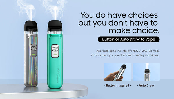 The Smok Novo Master Kit is a small and flexible vaping solution made for a great experience. This kit has a 1000mAh battery built in, and 30W max, so it lasts a long time. Two modes are designed to fit your different needs: Boost Mode (suitable for those who chase for the intense taste), Standard Mode (suitable for those who are content with the mild taste). There are two ways to vape: Button triggered, Auto draw. LED indicator design shows you the real-time battery power. In addition, Smok Novo Master Kit comes with the functions of childproof lock, top filling system, leak-proof design and stepless airflow control. Smok Novo Master is compatible with Novo/Novo 2/Novo 2X pods.