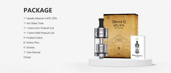 Alberich II MTL RTA of 22mm diameter is specially designed for MTL vapers.Top-to-bottom airflow design brings you concentrated, flavorful vapor; It has 6 airflow pins to optimize vapor experience: 0.8mm/1.0mm/1.2mm/1.5mm/1.8mm/2.0mm....