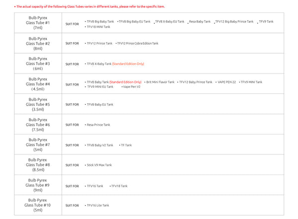 The replacement glass tube is custom designed for Smok TFV8 Baby Tank Atomizer( Silver & Black/Gun metal/Rainbow/Gold & Blue/Purple & Pink) & TFV12 Baby Prince