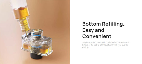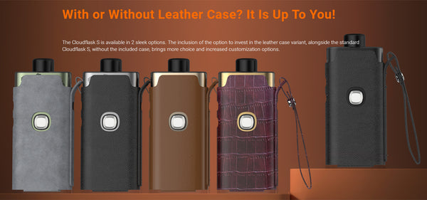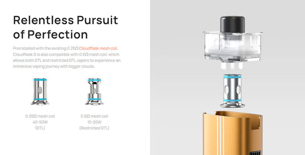Aspire Cloudflask S Kit comes with incredible value, massive cloud actions and is ready for HUGE performance. It is ergonomic and ruggedly durable with premium grade aluminum material. Cloudflask S not only adopts a 0.25ohm Cloudflask mesh coil for DTL vaping, but also supports an all-new 0.6ohm mesh coil for restricted DTL. You can enjoy amazing vaping experience when the unique double-side air inlets work with Bypass output. The Malaysia Version contains a leather case, and the Standard Version is not contains leather case. Cloudflask Pod is a bottom-filling pod of 5.5ml. Cloudflask S is built with 2000mAh battery and 2A type-c quick charging port.