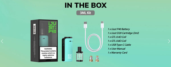 The Eleaf iJust P40 Starter Kit, offering a 1500mAh battery, 40W output maximum, and is natively paired with the 3mL iJust D20 Cartridge. Constructed from durable zinc-alloy, the chassis of the Eleaf iJust P40 Kit is lightweight and incredibly portable, easily fitting within the palm of the hand. Trading a screen for LED indicator lights, the iJust P40 Pod System further extends the battery life and adopts a chassis-based airflow control switch, carefully closing or opening the dual slotted design along the side of the device. The small footprint delivers a strong performance, utilizing the GTL Coil Series to output delicious vapor and flavor from the 0.4, 0.8, 1.2ohm coil options. The iJust P40 can also recommend the best wattage level for the coil and automatically remember your usual setting. The optional power levels and adjustable airflow can fully customize your vaping experience. The iJust D20 Pod Cartridge features 3ml capacity and easy top refilling system. It is compatible with all GTL Coil to bring you enhanced flavor and RDL/DL vaping.