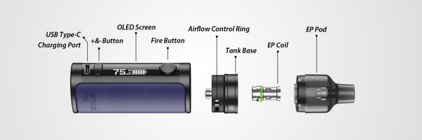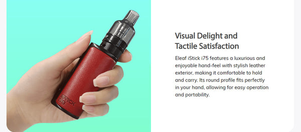 Eleaf iStick i75 Kit with stylish leather exterior is luxurious and comfortable to hold. It is composed of iStick i75 Device and EP Pod Tank 5ml. It is powered by a built-in 3000mAh battery with 75W max to bring you long-lasting vaping experience. Its OLED screen allows you to switch between VV (Variable Voltage) and VW (Variable Wattage) modes, granting you control over wattage levels from 1-75W and voltage from 0.5-9V. The EP Tank, with dual-side airflow control, offers a wide range of vaping experiences, from tight MTL to DL. This kit features a luxurious leather and metal construction, complete with a side-mounted round fire button for added convenience and comfort. With USB Type-C charging, it ensures a long-lasting vaping experience and supports EP Series Coils for rich clouds and enhanced flavo. Experience personalized vaping with the optional UI interface on this premium kit.
