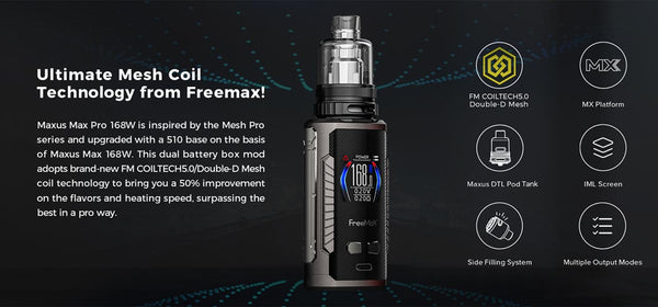 Maxus Max Pro 168W Kit is the first dual battery box mod equipped with MX Platform and innovative FM COILTECH5.0/Double-D Mesh technology. On the basis of the Maxus Max 168W Pod Mod Kit, Maxus Max Pro 168W is upgraded with a 510 base to meet a variety of vaping needs.