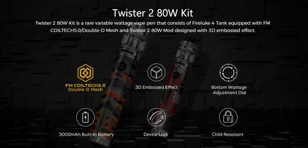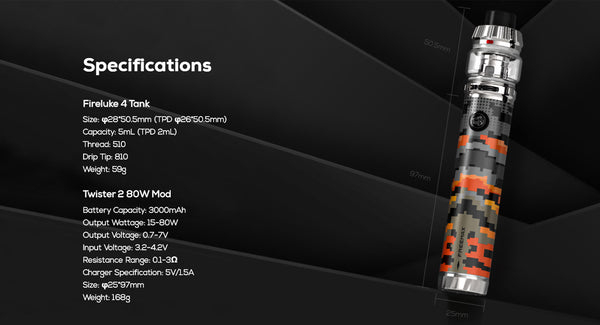 It consists of Fireluke 4 Tank equipped with FM COILTECH5.0/Double-D Mesh and Twister 2 Mod designed with a 3D embossed effect. Fireluke 4 Tank features a 5ml glass tube, a replaceable 810 drip tip, and a 510 base. Its top fill design is ISO 8317 Child Resistant Certified, which makes the tank super easy and convenient to fill and clean. Moreover, Twister 2 80W Mod is a variable wattage mod powered by a large 3000mAh built-in battery and charged with a 5V/1.5A USB Type-C cable.