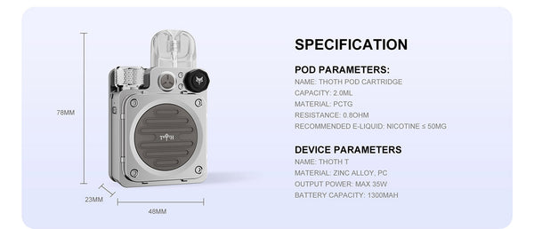 Presenting the THOTH T pod system by Kumiho with a distinctive radio-shaped design, blending fashion and creativity seamlessly. Encased in an elegant metal shell and compact for easy portability. Equipped with a 1300mAh battery with constant voltage output, the big battery capacity will support your whole day vaping. And the whole THOTH series pod cartridges and coils are compatible with the THOTH T device, together with the precise adjustable airflow system, you can get full vaping experience from RDL to MTL. Let's rock the puffs with this radio-vape.