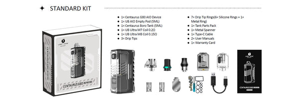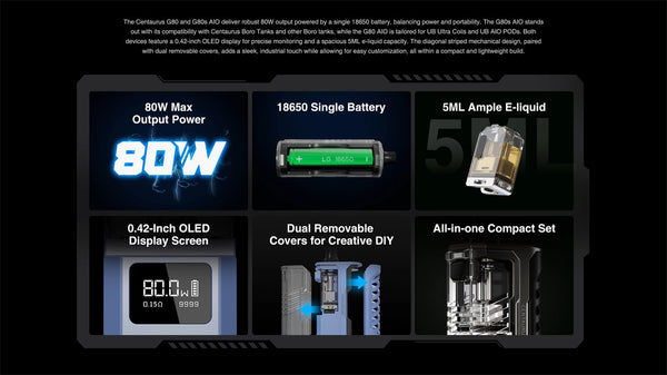 the Lost Vape Centaurus G80 AIO Pod Mod Kit, which features a 5-80W output range, a durable zinc and aluminum chassis, and a 5ml capacity in the Centaurus Boro Tank. This device is designed to blend visual appeal with top-tier vaping performance, offering a compact yet powerful solution. With an 80W output capability, the Centaurus G80 AIO is compatible with UB Ultra coils, allowing for easy coil installation at the base of the UB AIO Pod. Additionally, it supports most boro-style bridges when used with the Centaurus Boro Tank.