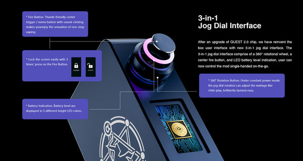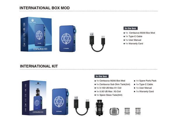 Lost Vape Centaurus M200 Box Mod Kit features a 200W Quest 2.0 chipset, variable wattage mode, temperature control settings, a color screen, two 18650 batteries (not included), a fire button that rotates to make adjustments, and a Type-C port to recharge the cells. The kit includes the Centaurus Sub Ohm Tank with UB max coils, top-to-bottom airflow control, a 5ml juice reservoir, and easy refills.the firing button with an LED ring that rotates to make adjustments to the settings. Where one would normally find plus/minus buttons on other mods.