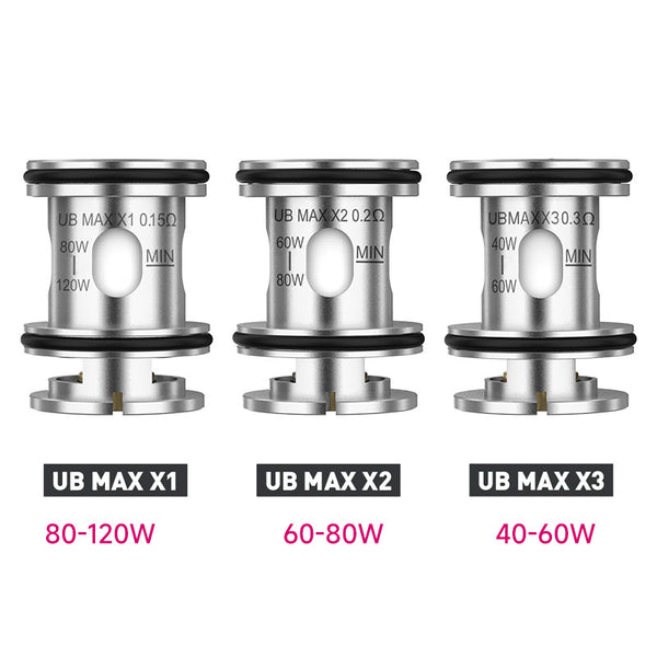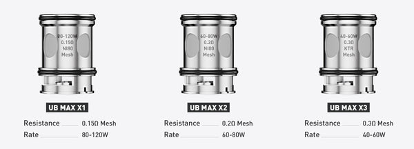 Resistance: UB Max X1 0.15ohm(80-120W), UB Max X2 0.2ohm(60-80w), UB Max X3 0.3ohm(40-60W)