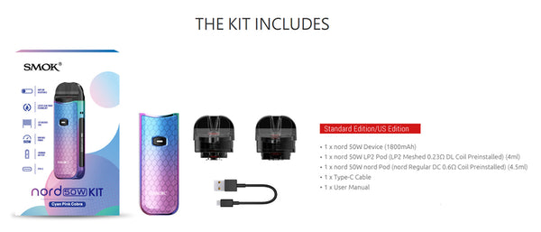 Thanks to continuous optimization and stable iterations, the new Smok nord 50W sets new standards for the nord series with an internal 1800mAh battery bringing you up to 50W of power to your satisfaction. The kit includes two versatile pods that work perfectly with the upgraded airflow system to deliver scrumptious flavor and massive vapor: one is the nord pod compatible with nord coil series, and the other is the LP2 pod compatible with LP2 coil series with enhanced leak-proof technology. Based on the classic appearance, the nord 50W advances into two collections featuring a variety of colors and premium textures to match your mood of the day. Innovation keeps changing the vaping experience!