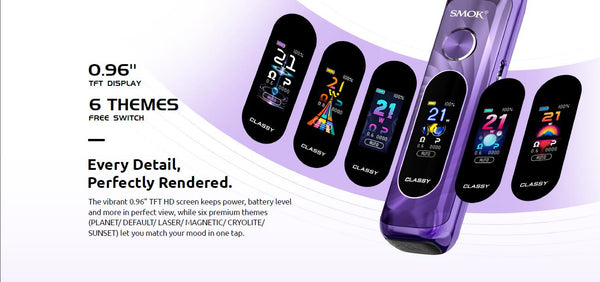 The SMOK Novo Classy Pod System Kit redefines elegance and performance in one compact device. Designed as a “gem in your palm,” the Novo Classy features a durable zinc-alloy body with a luxurious IML textured finish, offering a perfect balance between aesthetics and comfort. Powered by a 1350mAh built-in battery with a max output of 35W, it ensures up to 3 days of use on a single charge. The 0.96-inch TFT display provides real-time information and customizable themes for a personalized experience. With Auto and Memory modes, the Novo Classy intelligently adapts to your vaping style, offering smooth, flavorful vapor through its upgraded NOVO POD(CLX) series with leak-proof technology. Top-side filling, puff reminder, and Type-C fast charging make this device a refined blend of style and functionality.
