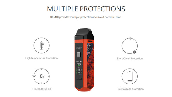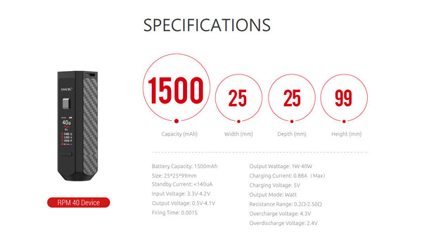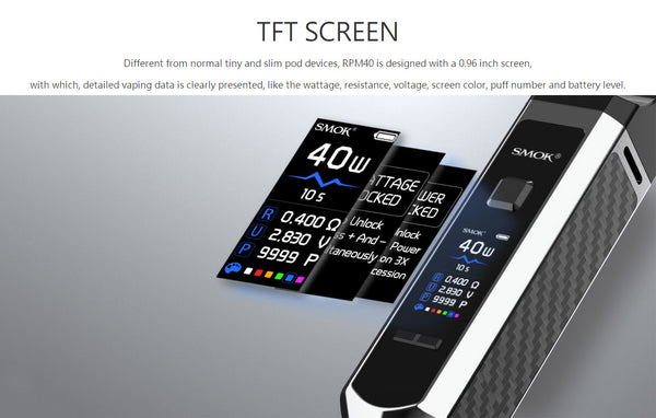 Smok RPM40 Pod Mod Kit is an ultra-portable pod mod that shapes like a cuboid and is covered with glossy finish and characteristic material, making the whole device look fancy and stylish. It is small in size but has a battery capacity of 1500mAh which can ensure enough running time and help you avoid frequent charging, and a power range of 1W-40W for you to adjust, and you can press the UP/DOWN button to get your preferred power. The internal IQ-R chip is a new one, shortening the firing time to 0.001S, and charging time to two hours. Different from normal tiny and slim pod devices, RPM40 is designed with a 0.96-inch screen, with which, detailed vaping data is clearly presented, like the wattage, resistance, voltage, screen color, puff number, and battery level. Besides, the newly designed RPM Mesh 0.4ohm Coil is designed for the best flavor and excellent vapor production. Innovation keeps changing the vaping experience!