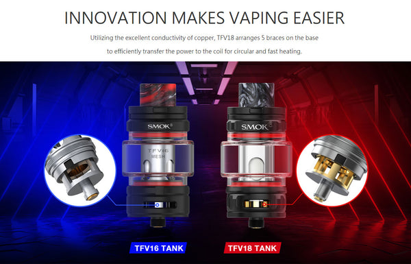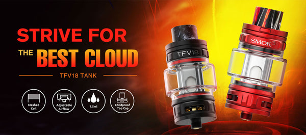 Smok TFV18 Tank features a 7.5mL capacity and clocks in at 32mm in diameter. The TFV18 Sub Ohm Tank introduces two new coils a 0.33Ω Single Mesh and 0.15Ω Dual...