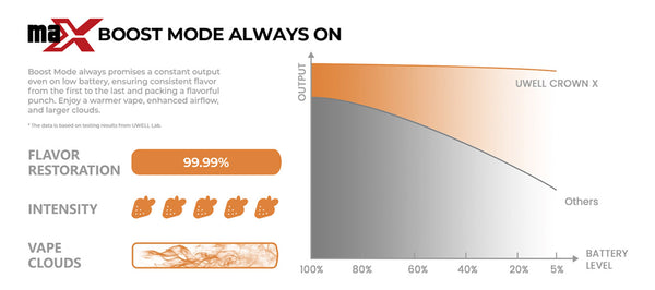 Uwell Crown X Pod System boasts max. 60W, 0.3ohm coil, delivering an ultimate DTL vape with a more cloudy and intense flavor to users. The Boost Mode always provides a constant output, ensuring consistent flavor from the first puff to the last. With this advanced feature, sub-ohm vape becomes even more powerful. The taste buds get hit with tons of flavor with each puff. You can experience warmer vape, more airflow, and bigger clouds.