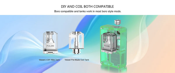 Vandy Vape Pulse AIO Mini Kit delivers up to 80W output, and smaller than the Original Pulse AIO & the Pulse AIO 0.5. its has compatibility with an external 18650 battery,he Mini has a Lexan EXL1414T Polycarbonate Reinforced Body for great protection. Included is a Square Button & Panel plus a Round Button & Panel. You will receive the Frosted Panel along with the Artsy Panel. Vessel 2 RBA Tank DIY has a 4.6ml Capacity, as well as offering you a 5ml Vessel Pre-made Coil tank(VVC coils). The Vessel 2 DIY RBA Tank boasts a curved 180-degree airflow for a more airy vaping experience. It is easy, intuitive, and remarkably functional, the screen provides Temp Control, Voltage, Bypass, and Smart Mode. Compatible with VVC coils, it obviously designed for all types of vaping.
