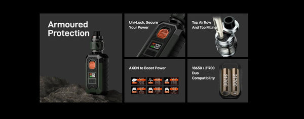 Vaporesso Armour Max and Armour S are the new dual/single 21700 box kit for advanced DTL vapers. Crafted entirely from TPU material, Armour envelops your tank and mod, ensuring comprehensive defense. And it's not just about protection, it's about sm art engineering like the uni-lock that sim plify your experience and elevate your vaping journey. With the innovative iTank T and GTi coils, it provides more accurate flavor and 50% longer lifespan.The iTank T features a top airflow and top-fill system, making it easy to use while significantly reducing the risk of leakage. Crafted entirely from TPU material, ARMOUR envelops your tank and mod, ensuring comprehensive defense.