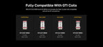 Coil Resistance: GTi 0.2ohm Mesh Coil (60-75W), GTi 0.4ohm Mesh Coil (50-60W)